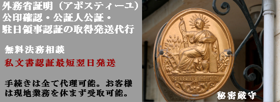 日本国外で使用する商事,民事,ビザ申請等の各証明書認証取得代行(外務省証明(アポスティーユ・公印確認)・駐日外国領事認証・公証代行),お客様へ発送(EMS,書留速達等)致します。